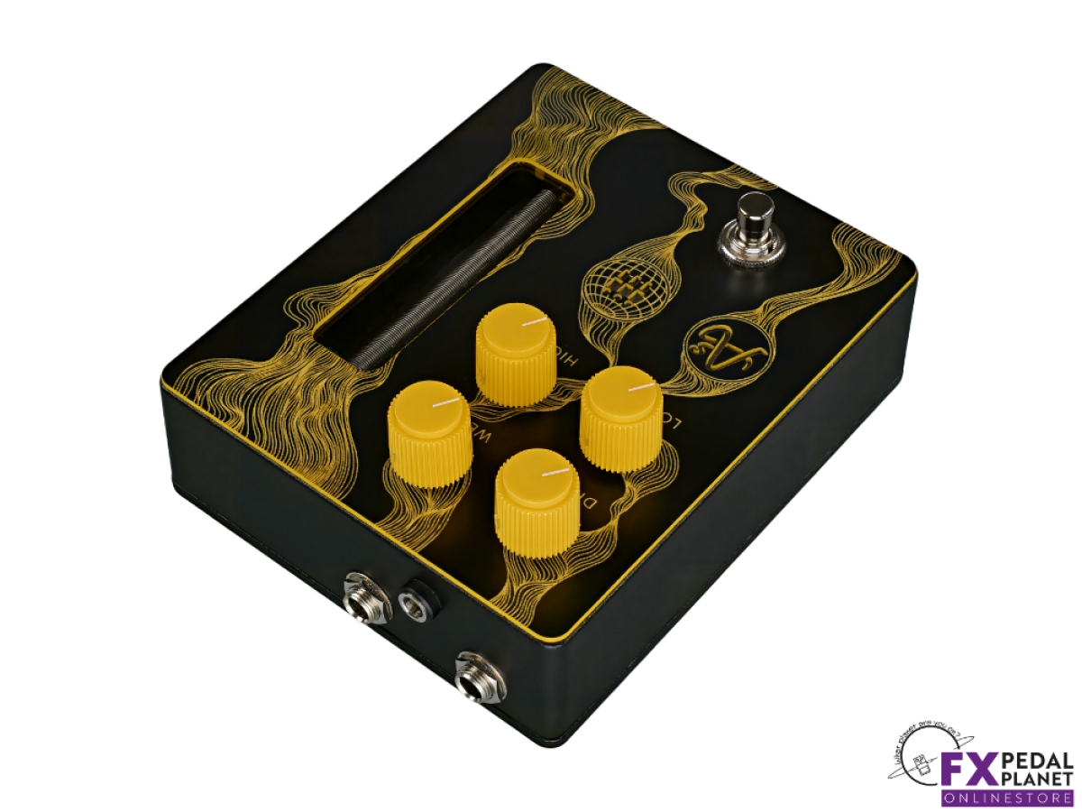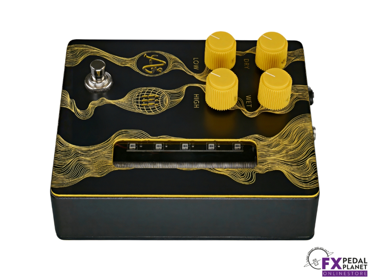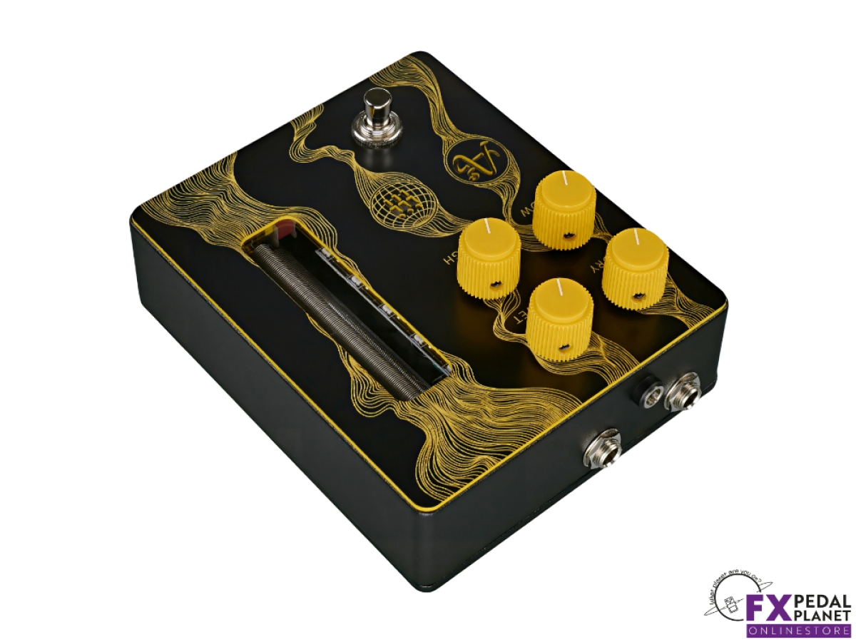 The enclosure is robust and engineered to house the integrated tank securely. A black metal chassis with engraved detailing and a plexiglass window reveals the three springs beneath, combining practicality with distinctive stage presence. The illuminated spring chamber provides a clear visual cue when powered, while the layout remains intuitive and accessible on a crowded board.