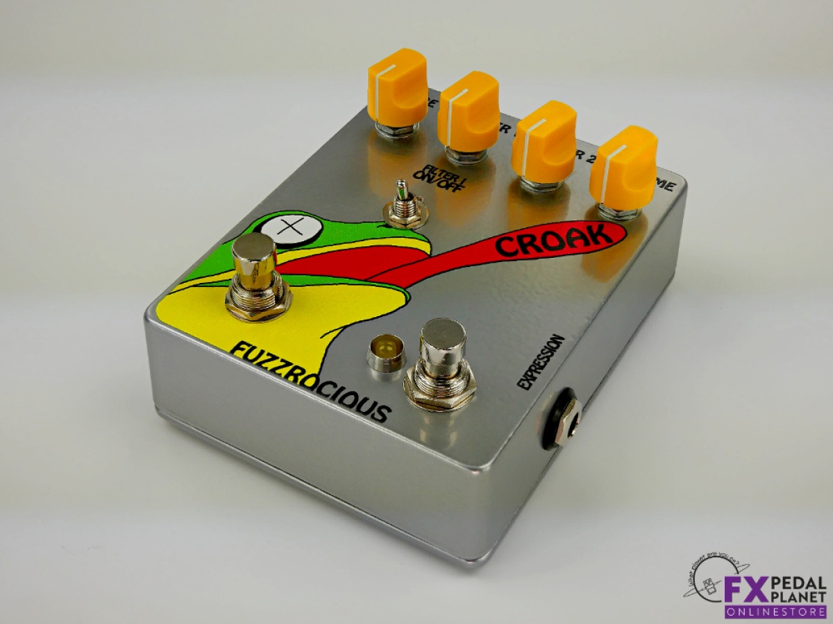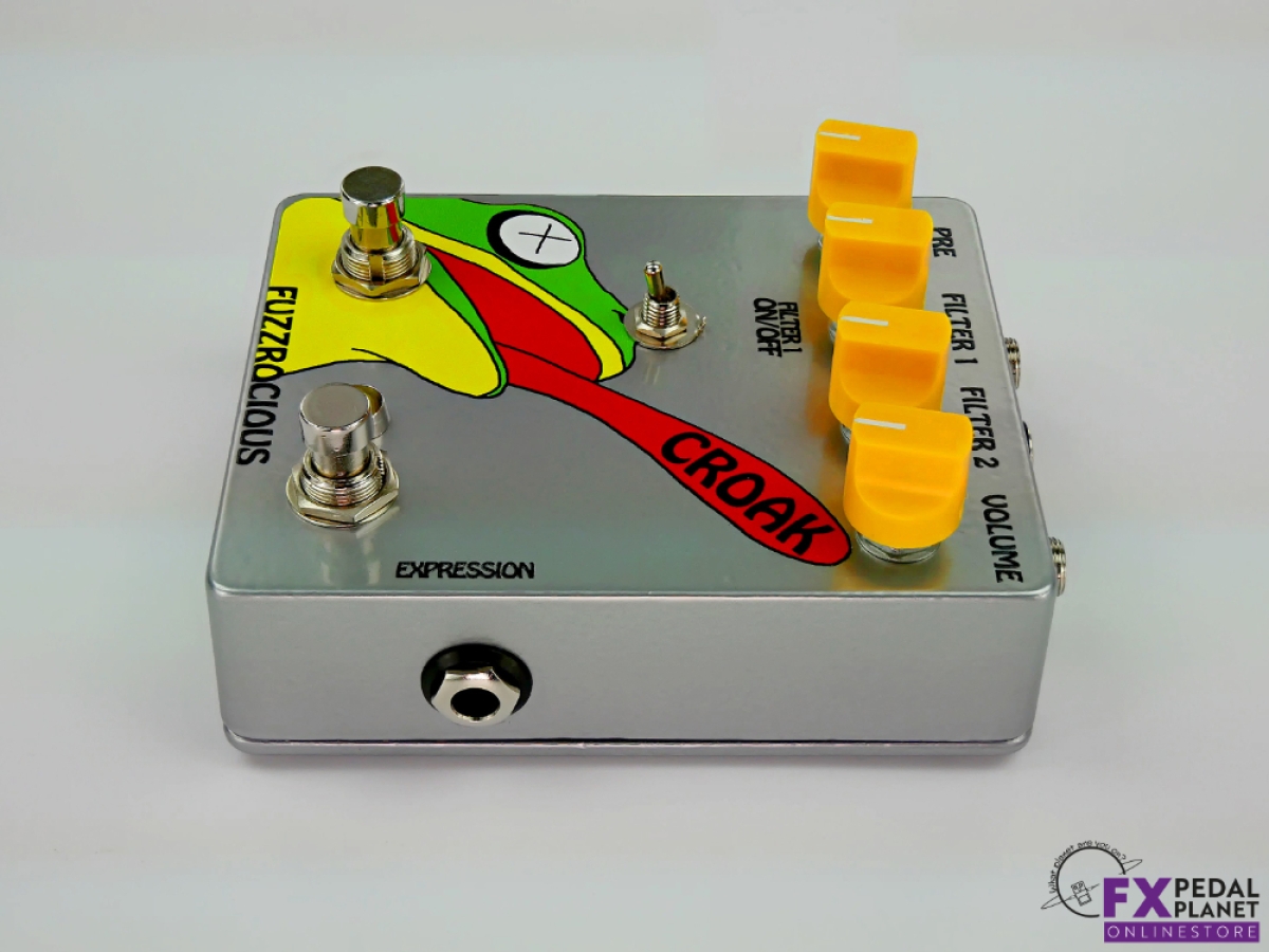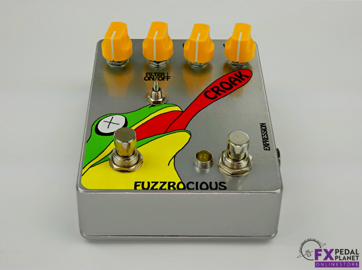 Fuzzrocious Pedals Croak is an “expressive double filter fuzz”. OK, so what does that actually mean? Within the Fuzzrocious Pedals Croak, there are two filters pushed by a fuzz that opens up to more control via an expression pedal jack. Think, fuzz, filter, double filter and envelope filter, all in one superb hand built pedal.