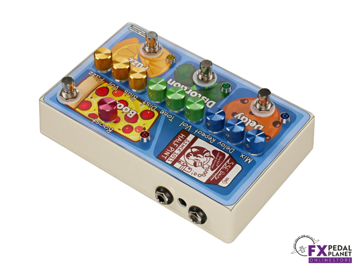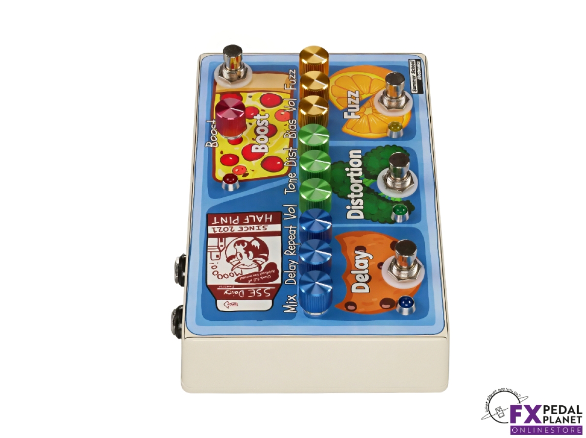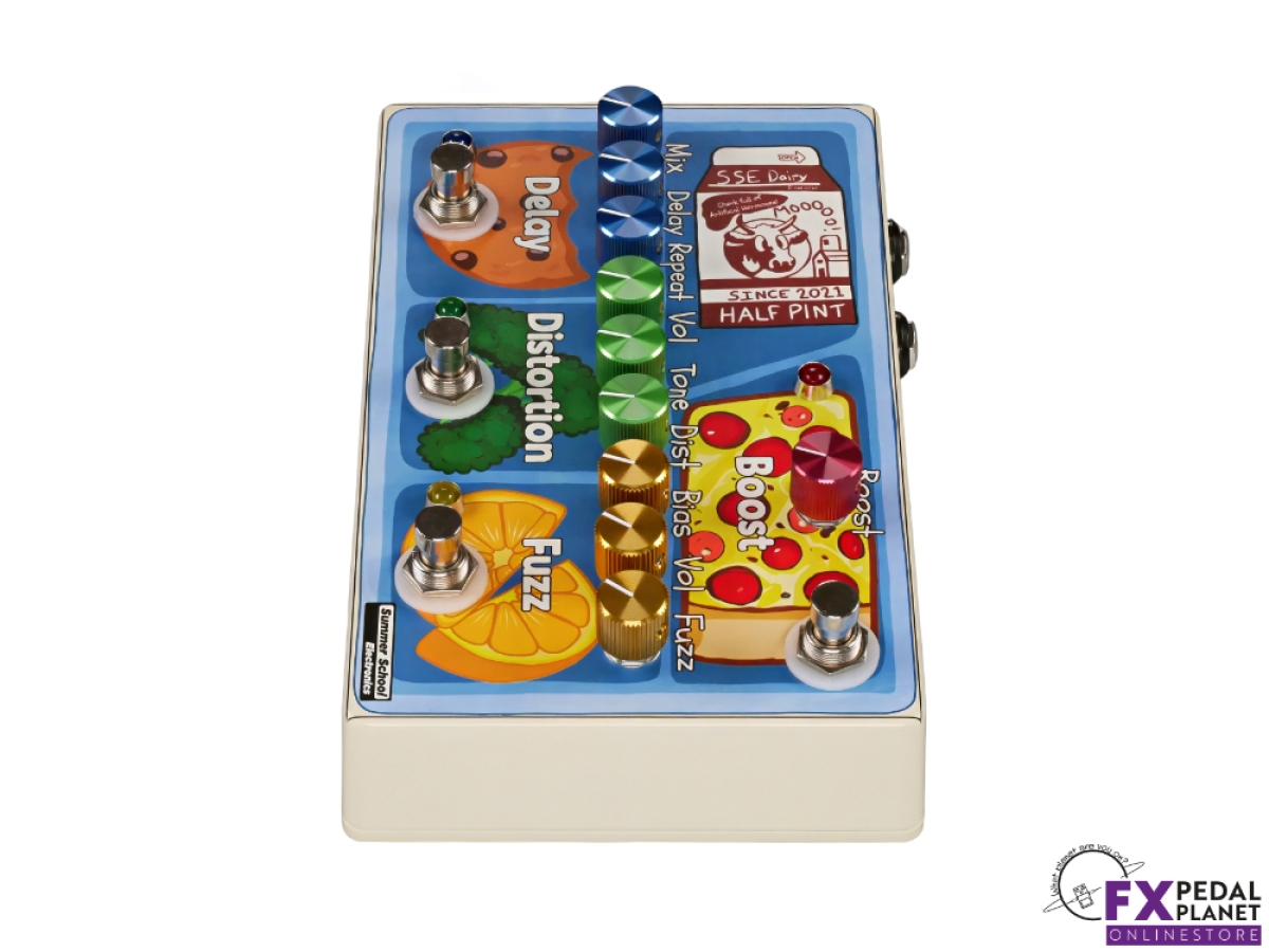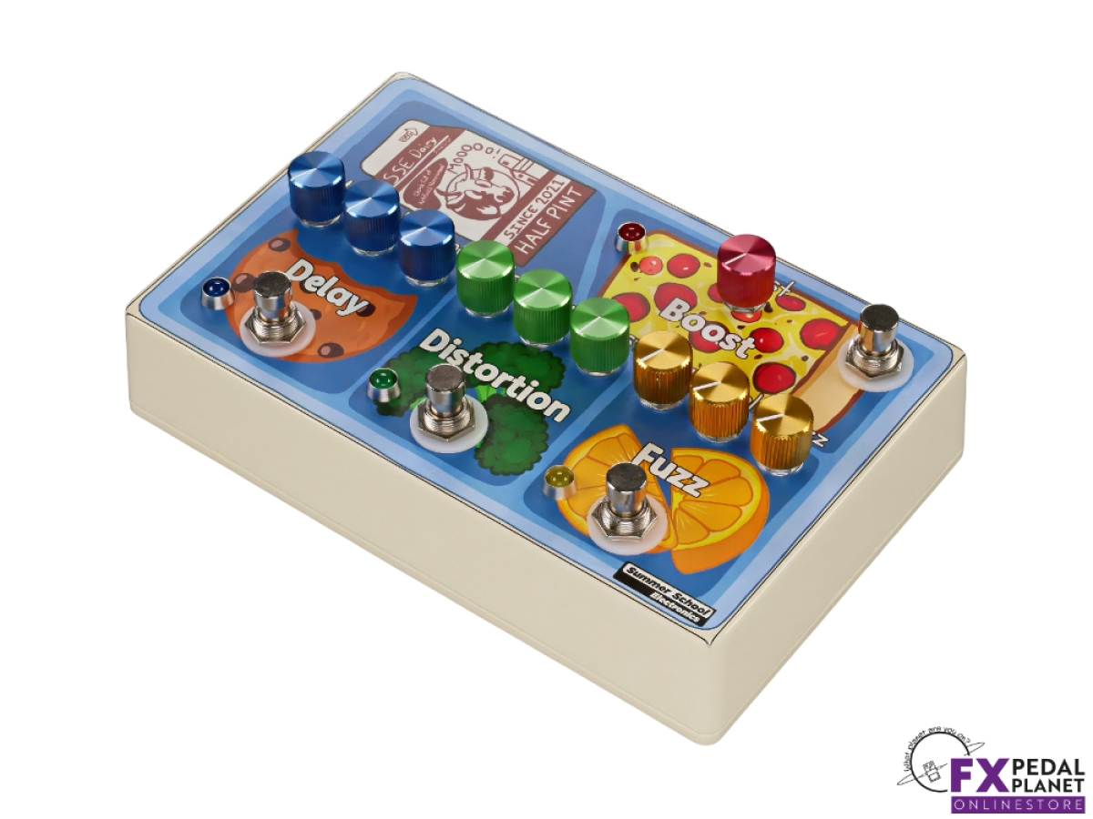 The Summer School Electronics School Lunch is a compact multi effect pedal that gives guitarists and bass players four essential effects in one unit: fuzz, distortion, delay and boost. It’s ideal for players who want to save space on their pedalboard without sacrificing tone or versatility. Designed to cover multiple genres, it delivers the key sounds any rig needs without hauling an entire board. According to the maker, it “hits all the must have sounds for multiple genres” in a “small footprint.”