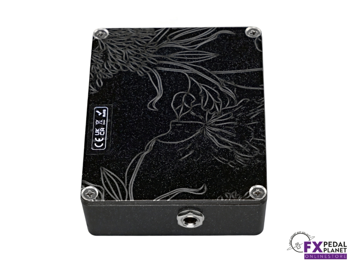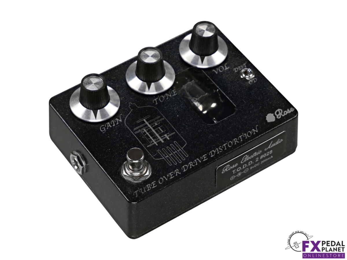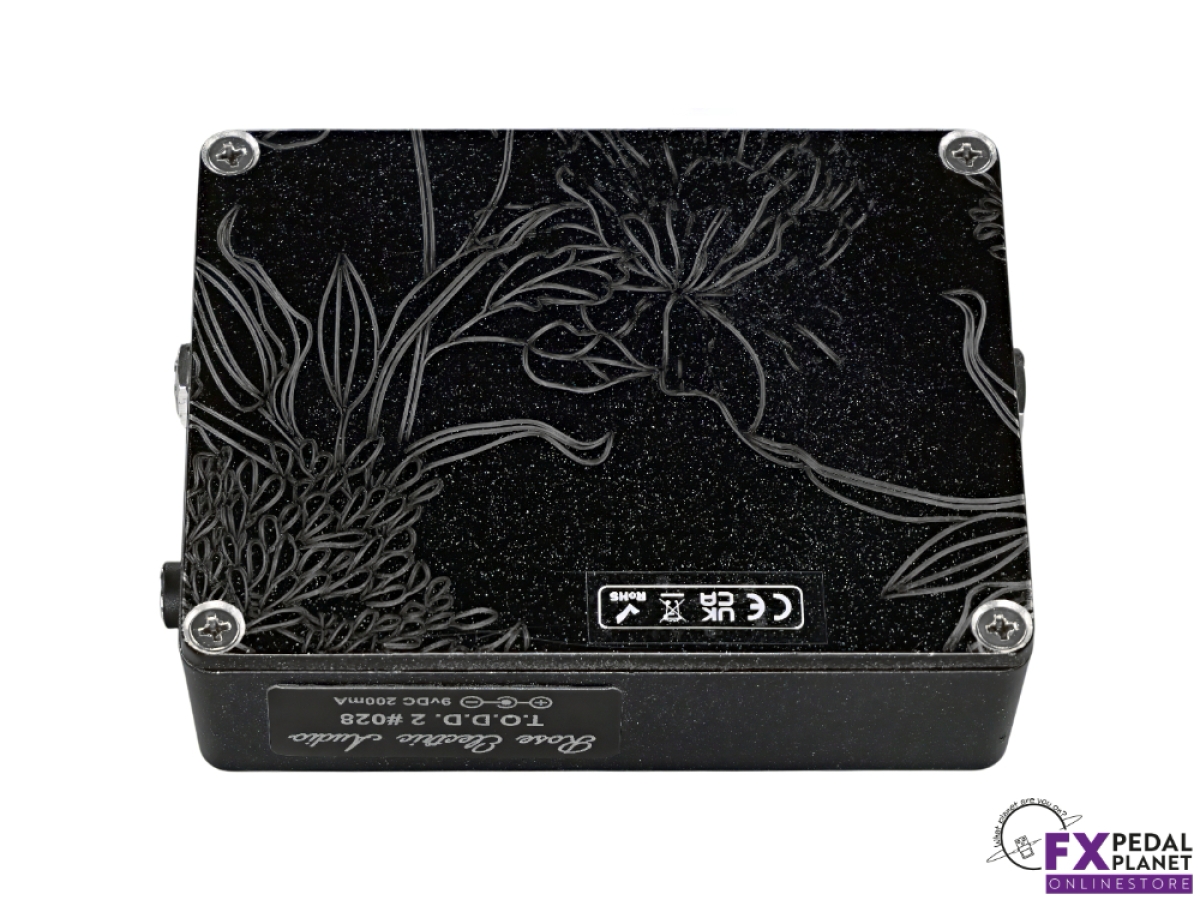 The Rose Electric Audio T.O.D.D. 2 is housed in a robust all-metal enclosure designed for regular use on professional pedalboards. Its construction reflects Rose Electric Audio’s approach to durability and practicality, ensuring it can withstand transport, rehearsal and performance without issue. The finish is a distinctive black sparkle with white graphics and chrome controls, offering clear visibility and a striking presence without being distracting. A clear vale window on the top surface illuminates when T.O.D.D. 2 is engaged, allowing the warm glow of the valve to be seen under stage lighting, while also providing immediate visual confirmation of operation. The rear of the enclosure features detailed engraving, reinforcing the sense of purpose and attention to detail throughout the design.