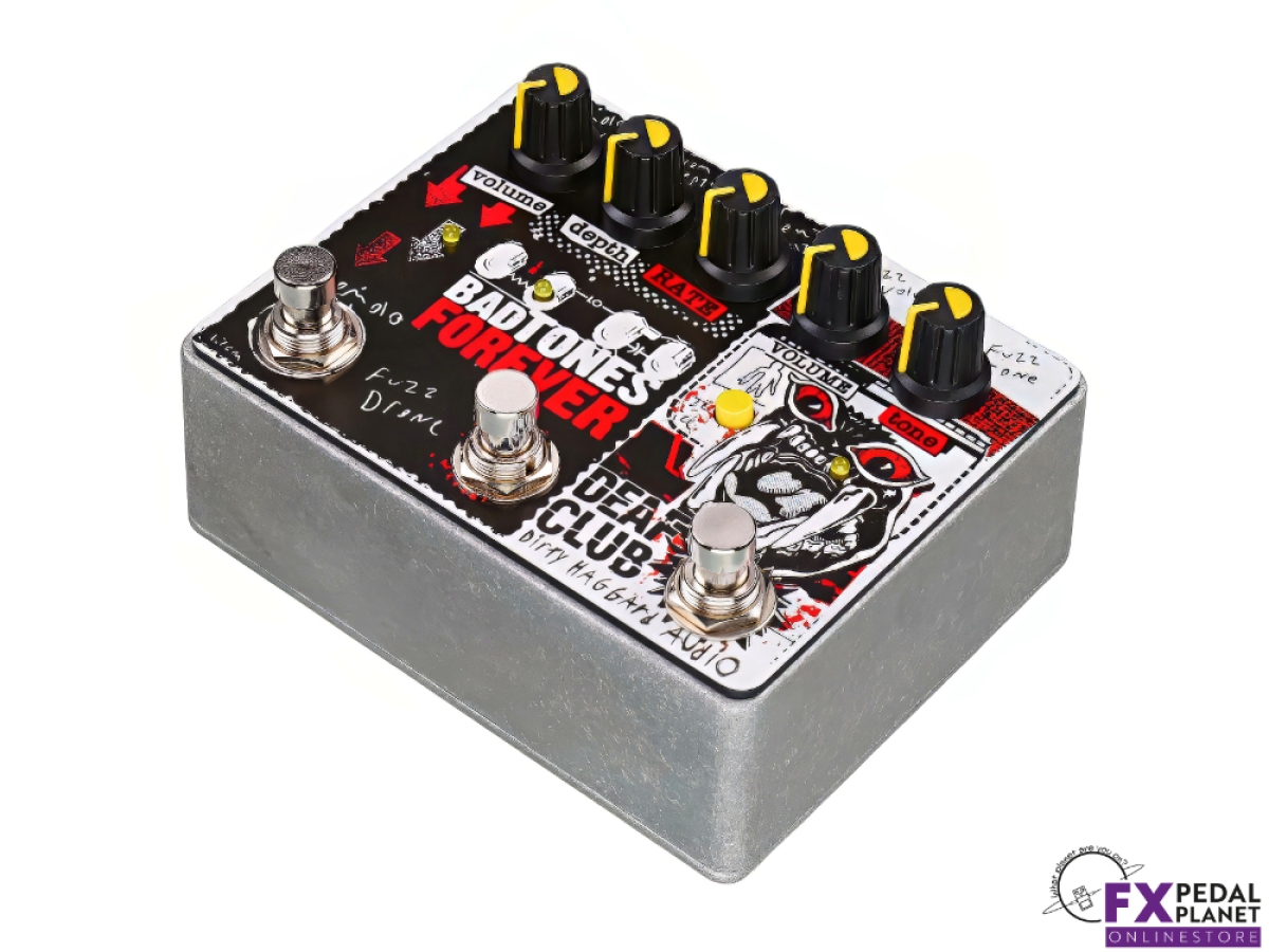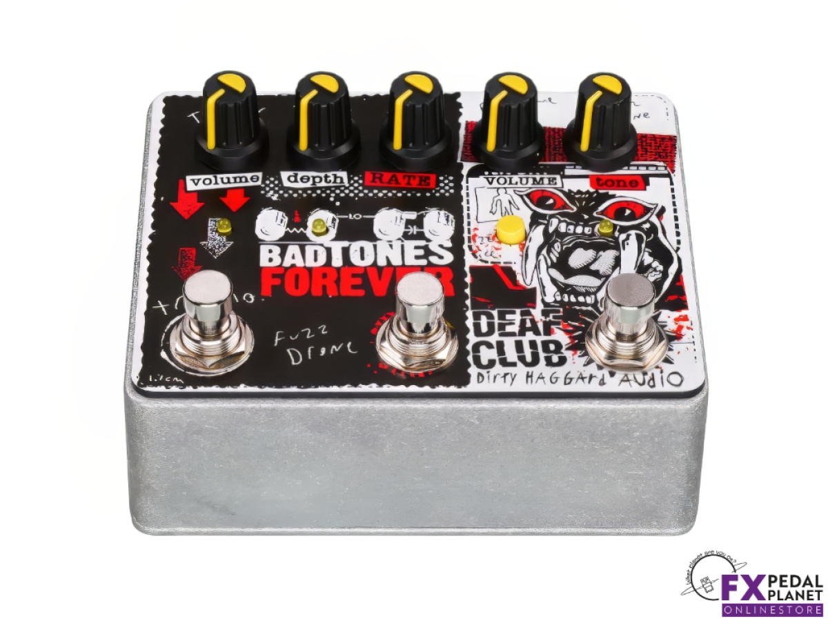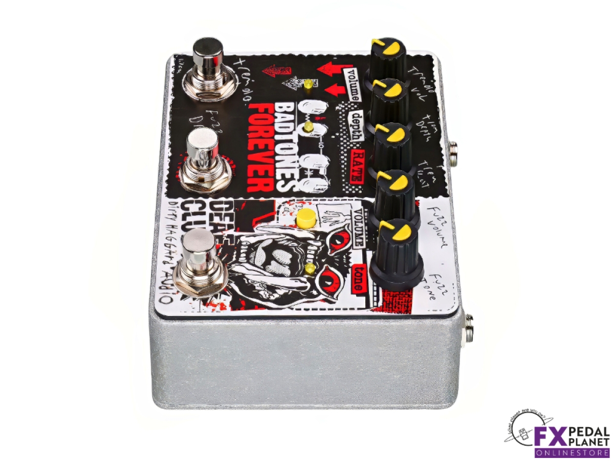 Housed in a rugged, all metal enclosure, the Dirty Haggard Audio Bad Tones Forever is built to withstand relentless stomping and high energy performances. The graphics are bold and uncompromising, matching the pedal’s sonic attitude and making a statement on any pedalboard.