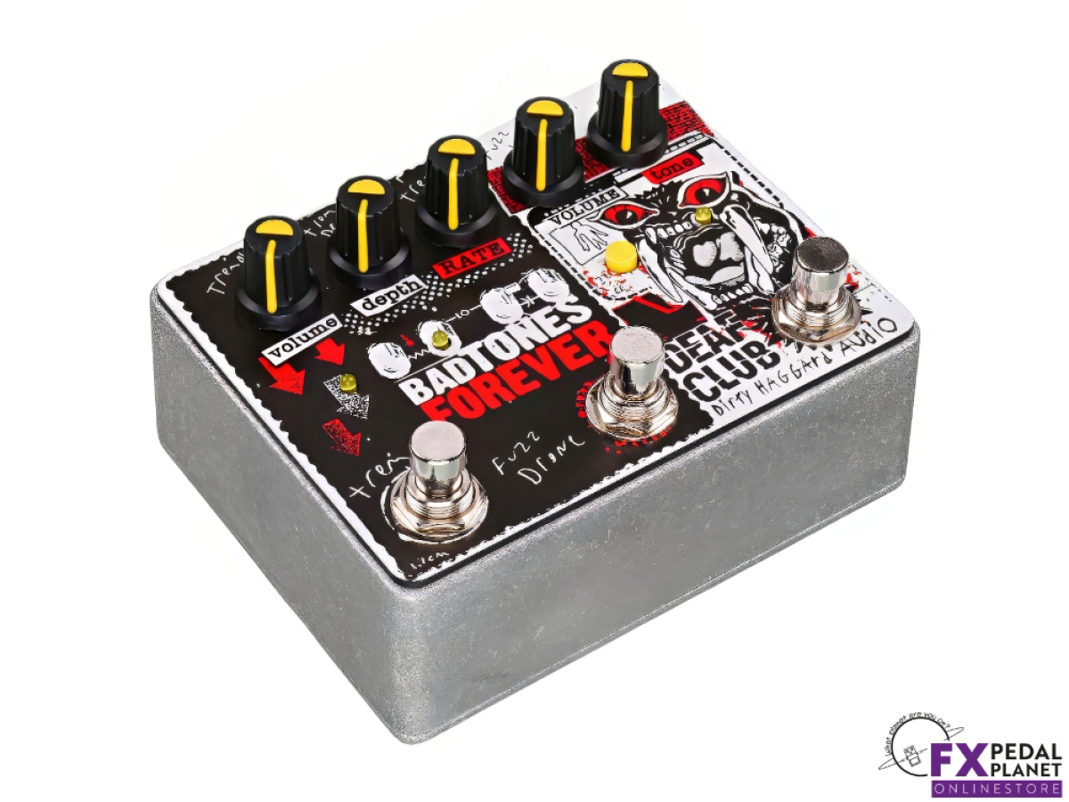 The Bad Tones Forever is a limited edition collaboration between Dirty Haggard Audio and the band Deaf Club, designed for those who embrace sonic destruction and untamed creativity. This unique pedal combines fuzz, drone, and tremolo functionalities, offering musicians the ability to create unconventional and experimental sounds. Built in Portland, Oregon, and featuring artwork by Paul Rentler, the Dirty Haggard Audio Bad Tones Forever pushes sound to its breaking point, delivering raw, spitty, and gated fuzz with pulsating tremolo and a deep, droning backbone. Whether you're wielding a guitar, bass, or baritone, the Bad Tones Forever opens up new realms of frequency annihilation.