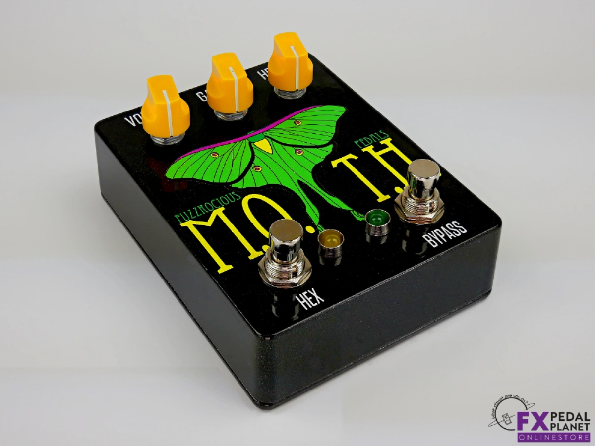 Fuzzrocious Pedals M.O.T.H. is a hybrid of a few things. It is an overdrive pedal, a fuzz pedal, a tremolo pedal and a noise machine oscillator. The Fuzzrocious Pedals M.O.T.H. does all of the things that people want in a moth. It flutters, zips, and can fly transparently through the air.
