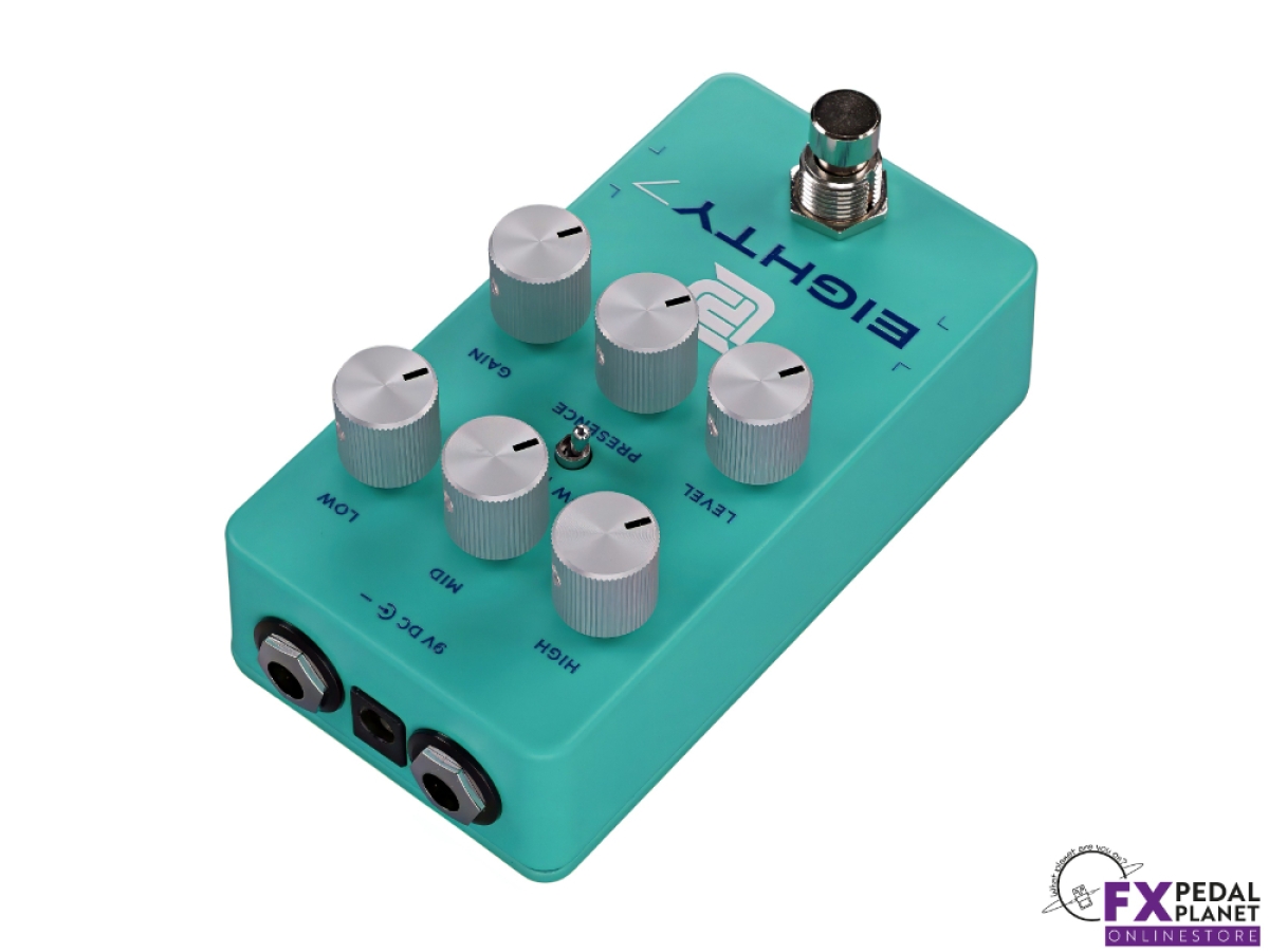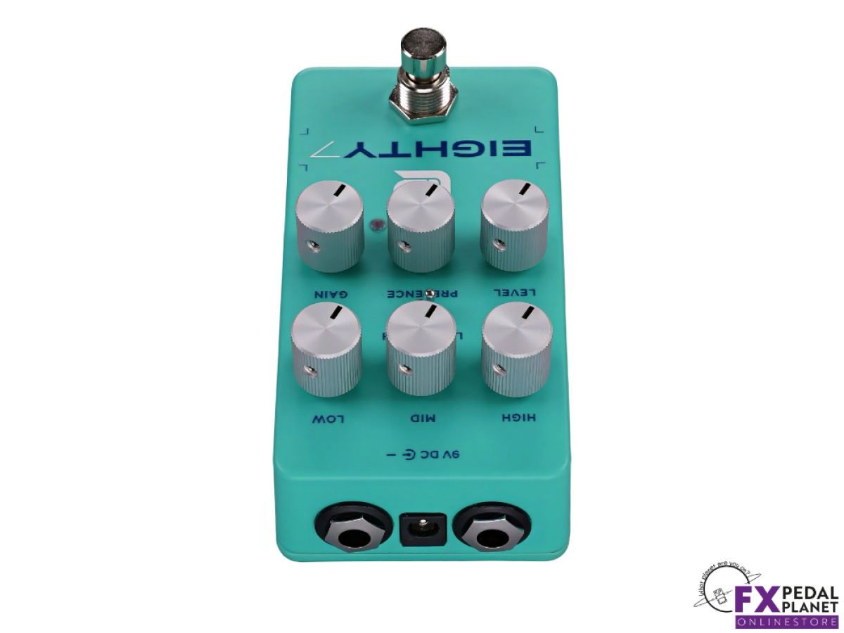 Built to last, the LPD Pedals Eighty7 comes in a rugged cast aluminium enclosure finished in striking Jamaican Teal powder coat. The hardware is solid and reassuring, with custom aluminium knobs chosen for smooth resistance and precise control. Top mounted jacks make for an efficient, tidy setup on crowded pedalboards, while the compact footprint ensures it fits easily among other effects.